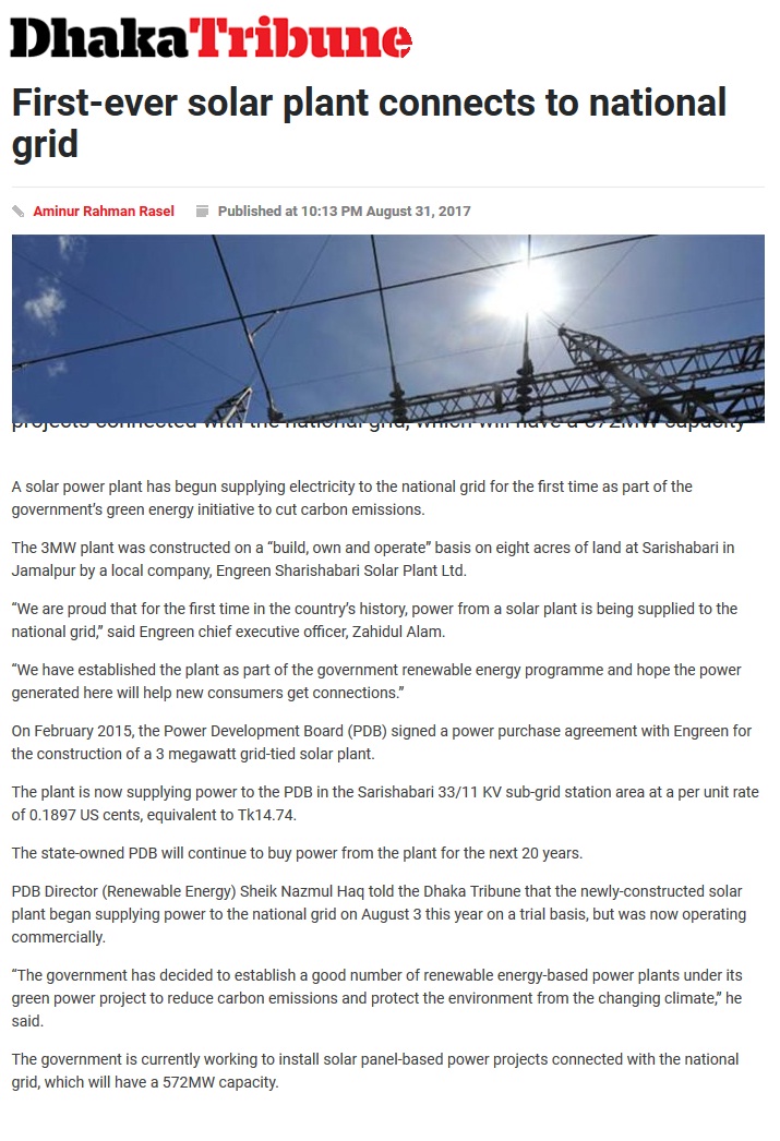 Dhaka Tribune News of 3MWp Solar Plant_31-Aug-17